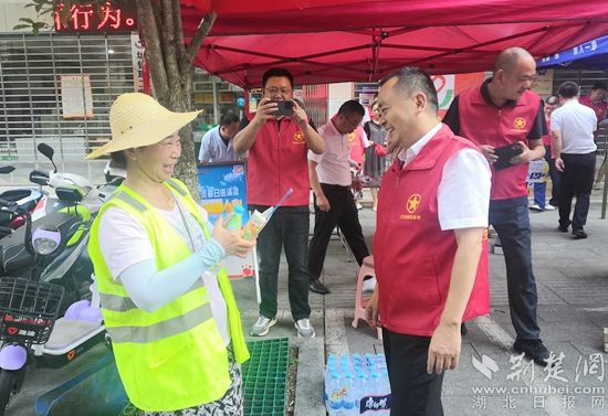 當天上午,獻血車??吭诩t安縣衛(wèi)健局門前,車身“炎炎夏日送清涼 點滴關(guān)愛暖人心”橫幅十分醒目,烈日下,血站工作人員和市無償獻血志愿者服務(wù)總隊紅安分隊隊員們?yōu)槁愤^的環(huán)衛(wèi)工人、外賣小哥等高溫作業(yè)人群免費發(fā)放礦泉水、塑料小扇、果汁等夏季解暑降溫的用品。
