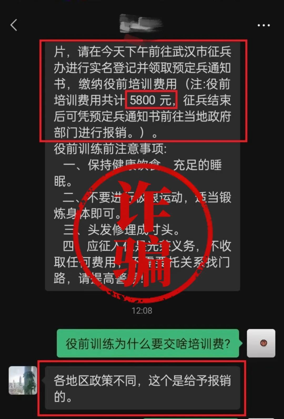 每年征兵工作的各個(gè)階段,總有“不法分子”借機(jī)行騙,近日就出現(xiàn)了這樣一則以各地準(zhǔn)備役前教育工作為契機(jī),聲稱“繳納役前教育培訓(xùn)費(fèi)用”進(jìn)行征兵詐騙。
