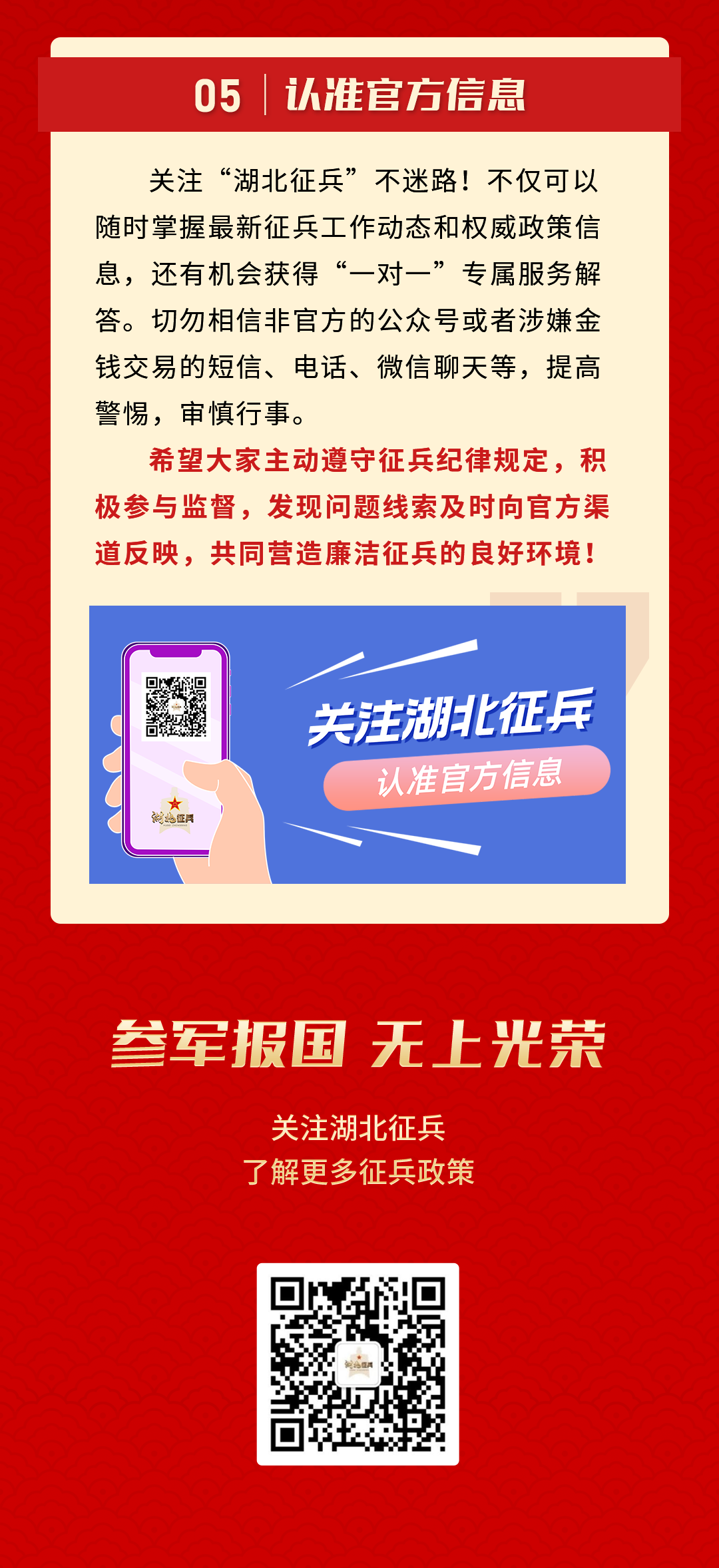 每年征兵季,總有不法分子利用部分青年參軍心切以及對(duì)征兵政策、流程不了解等弱點(diǎn),花言巧語騙取錢財(cái)。應(yīng)征入伍的過程中,一定要認(rèn)準(zhǔn)官方權(quán)威渠道。