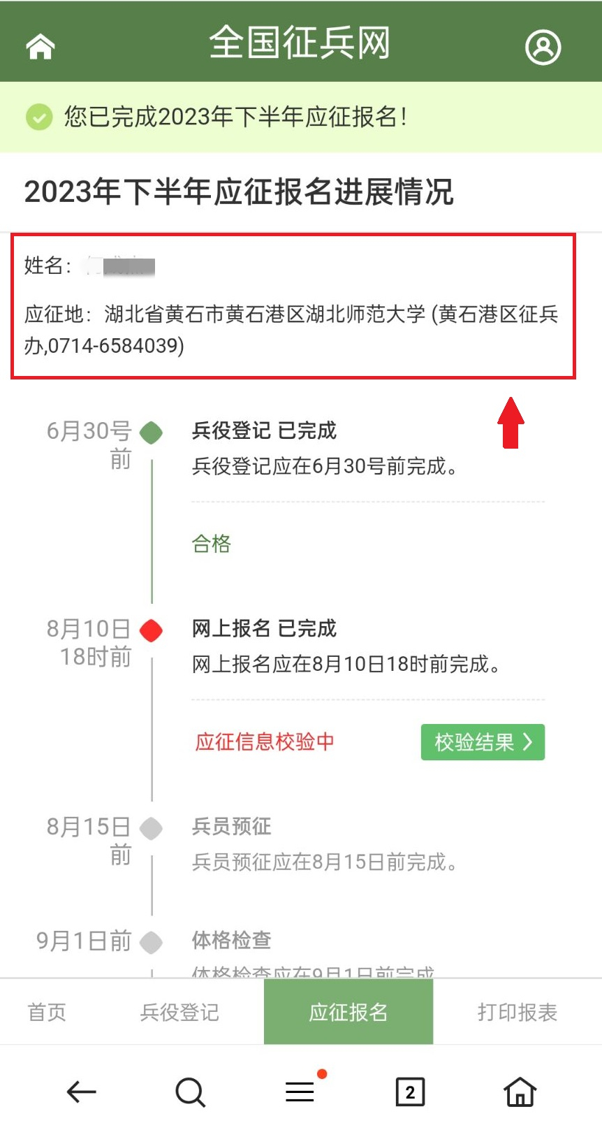全國征兵網(wǎng)是應(yīng)征報(bào)名唯一官方網(wǎng)站,應(yīng)征青年完成報(bào)名之后,系統(tǒng)會(huì)自動(dòng)顯示應(yīng)征地和所屬征兵辦的咨詢電話,有任何疑問都可以撥打咨詢。應(yīng)征地征兵辦也會(huì)主動(dòng)聯(lián)系溝通相關(guān)事宜,不要輕信來路不明的工作人員,提高警惕!