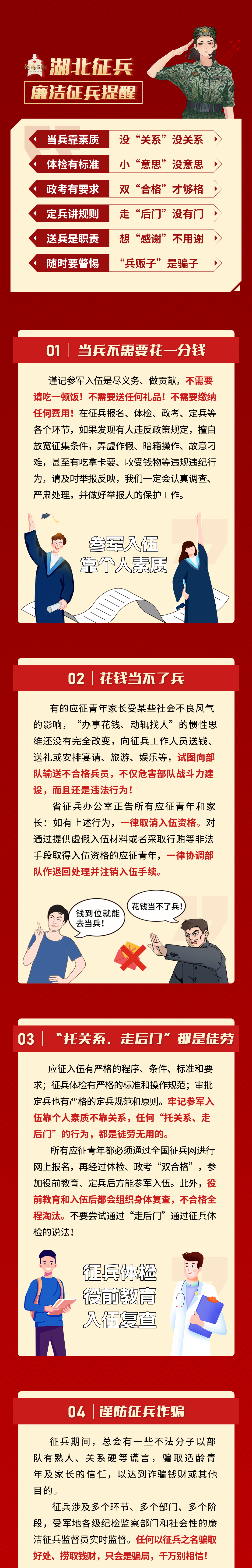 參軍入伍相關(guān)信息,以各級(jí)兵役機(jī)關(guān)發(fā)布為準(zhǔn),入伍青年手續(xù)通過兵役機(jī)關(guān)正規(guī)渠道辦理,如果遇到“征兵詐騙”,可以向各級(jí)兵役機(jī)關(guān)舉報(bào),不法分子必將受到法律嚴(yán)懲。