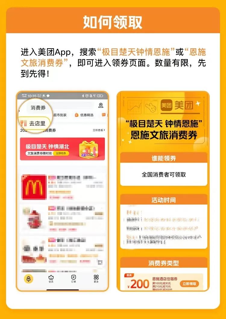 在美團(tuán)和大眾點(diǎn)評(píng)App搜索“恩施文旅消費(fèi)券”“恩施消費(fèi)券”等關(guān)鍵詞,進(jìn)入活動(dòng)頁(yè)面領(lǐng)券。已領(lǐng)取的消費(fèi)券可在“美團(tuán)App-我的-紅包卡券-券包”或“大眾點(diǎn)評(píng)App-我的-錢(qián)包-現(xiàn)金券”內(nèi)查看,活動(dòng)期間,消費(fèi)券數(shù)量有限,領(lǐng)完即止。
