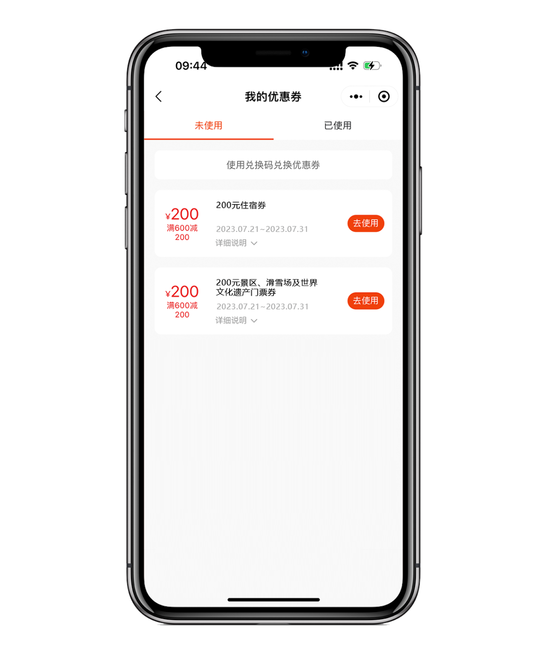 2、景區(qū)、滑雪場(chǎng)及世界文化遺產(chǎn)門(mén)票券:包括滿(mǎn)50元減10元、滿(mǎn)100元減30元、滿(mǎn)210元減70元、滿(mǎn)600元減200元四種。