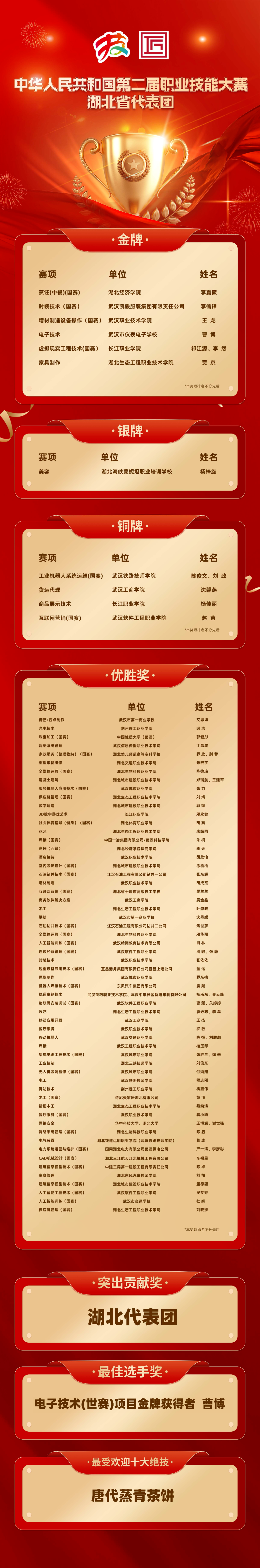 9月19日,中華人民共和國第二屆職業(yè)技能大賽在天津閉幕,在109個賽項中,湖北代表團(tuán)勇奪6個項目金牌(7人)、1個項目銀牌(1人)、4個項目銅牌(5人),實現(xiàn)歷史性突破。