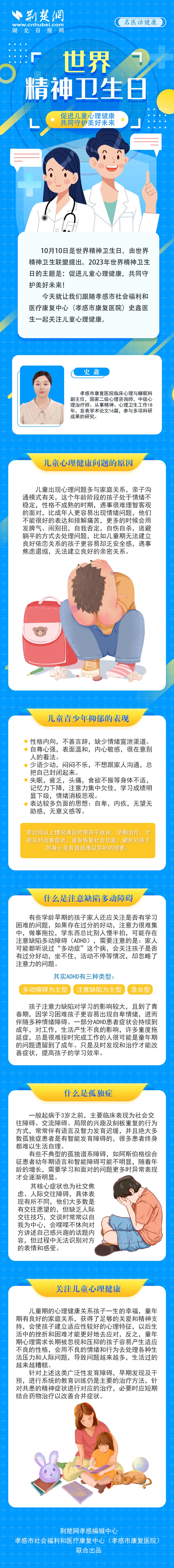 10月10日是世界精神衛(wèi)生日,由世界精神衛(wèi)生聯(lián)盟提出。2023年世界精神衛(wèi)生日的主題是:促進兒童心理健康,共同守護美好未來!今天就讓我們跟隨孝感市社會福利和醫(yī)療康復(fù)中心(孝感市康復(fù)醫(yī)院)史鑫醫(yī)生一起關(guān)注兒童心理健康。
