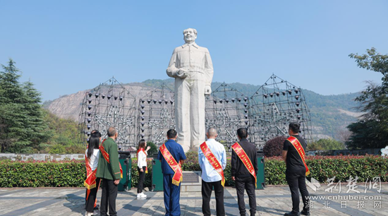 在日出東方廣場(chǎng),楷模們瞻仰偉人毛澤東的石雕塑像,靜靜聆聽講解員敘述領(lǐng)袖考察鐵山時(shí)的故事。石雕塑像上,毛主席褲子上的補(bǔ)丁清晰可見,似乎在引導(dǎo)楷模們傳承節(jié)儉美德,發(fā)揚(yáng)奮斗精神。進(jìn)入礦冶大峽谷“亞洲第一天坑”赫然在目,神似大地指紋的山體巖壁,令楷模們贊嘆不已。