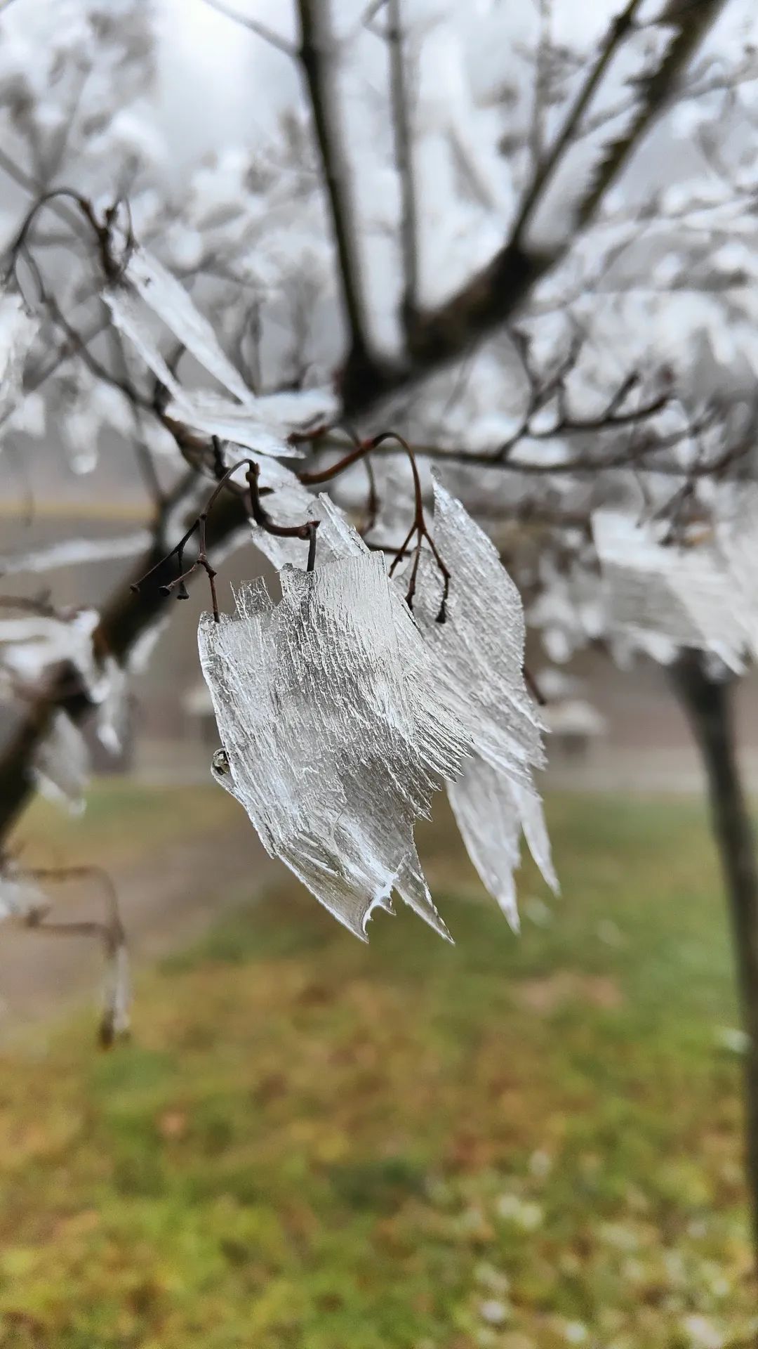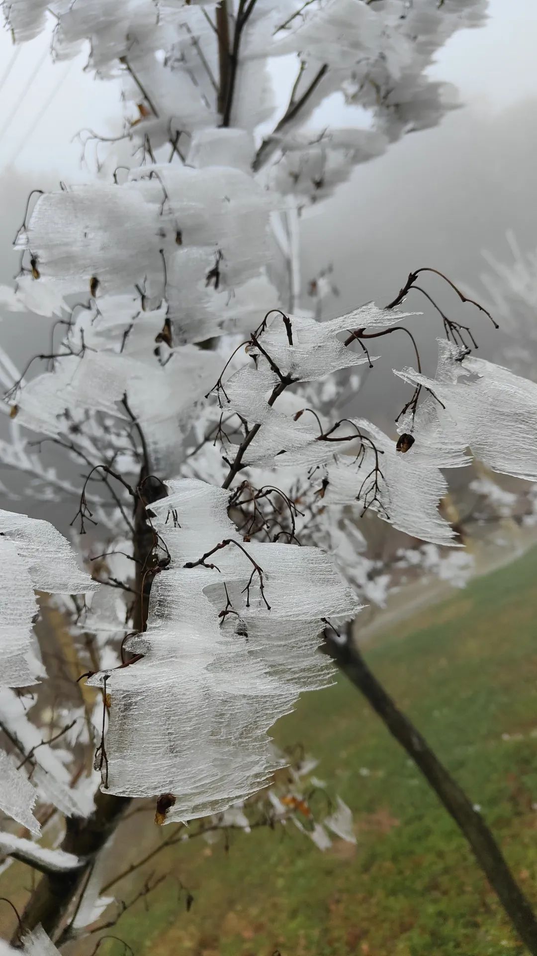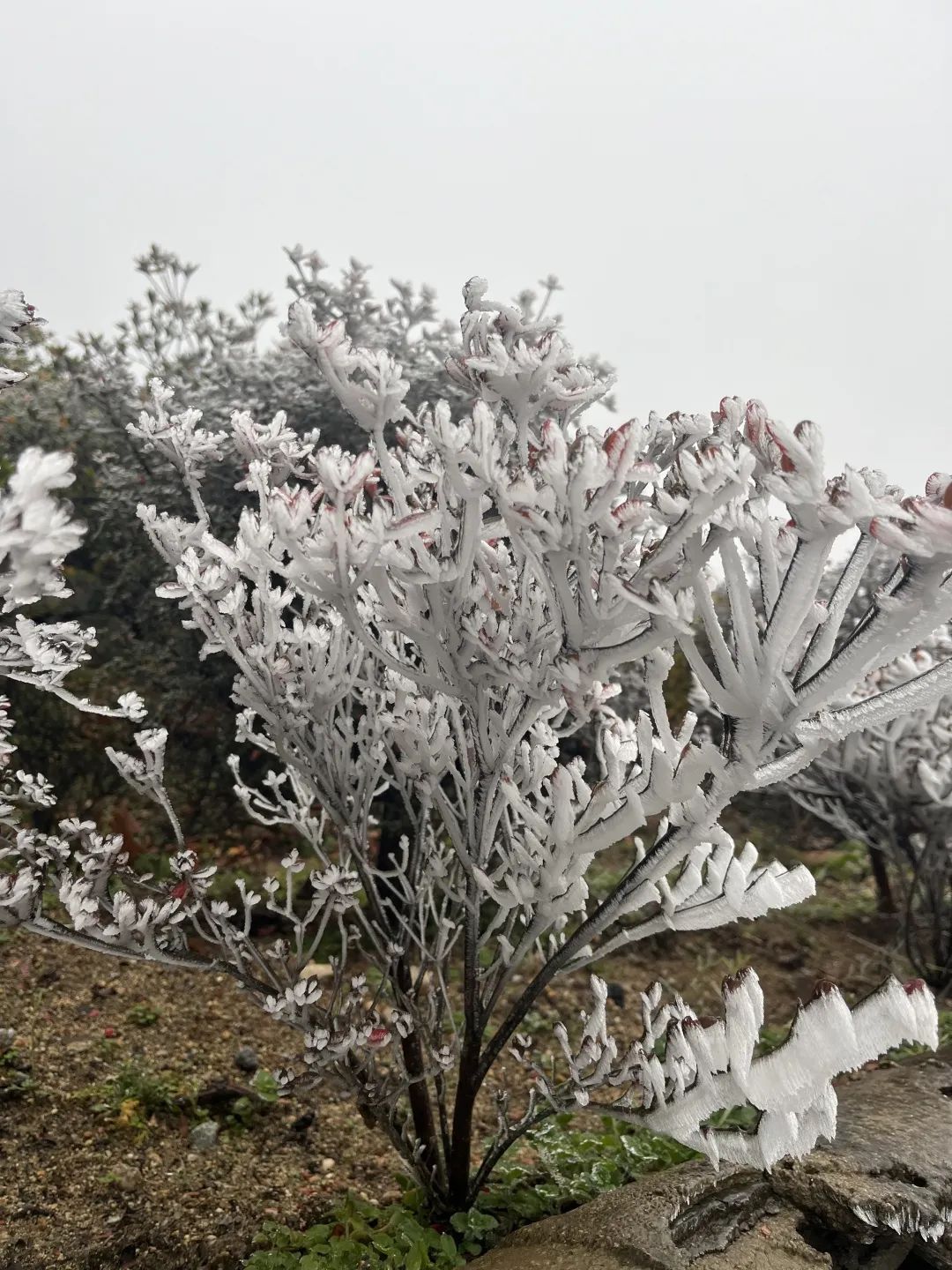 那些不透明的冰晶簇?fù)碓谝黄?,一層疊一層,一團(tuán)接著一團(tuán),被霧凇包裹的草木一枝挨著一枝,一簇連著簇,就像無(wú)數(shù)潔白的花朵開(kāi)在山間,極其壯觀。