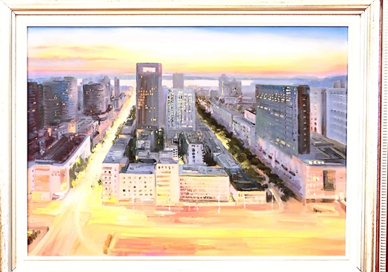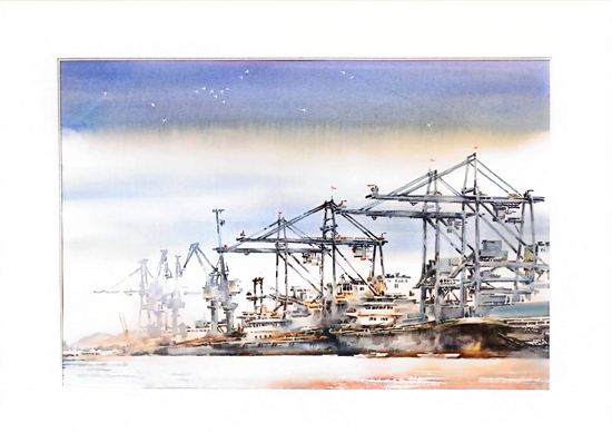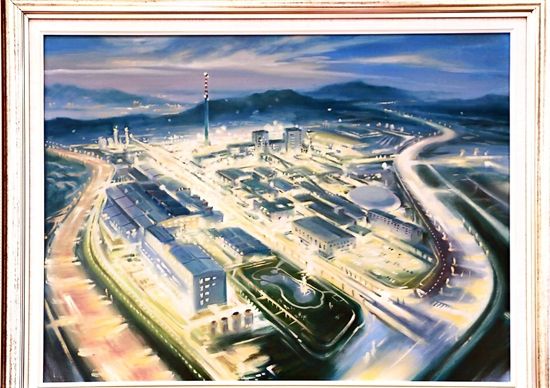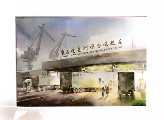 第一幅畫,展示的是數(shù)只船舶在新港碼頭裝卸貨物的繁華景象。第二幅畫,卡車進入棋盤洲綜合保稅區(qū)外卡口的實景記錄。第三幅畫,描繪的是園區(qū)夜間工廠燈火通明、24小時生產(chǎn)不停的場景。第四幅畫,以綠色為底色,展示的是人與自然和諧共生的美景。第五幅畫,描繪的是棠梨湖商業(yè)街的街景。