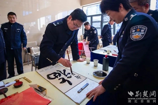荊楚網(wǎng)(湖北日報(bào)網(wǎng))訊(通訊員 王廳 張宏斌)迎春納福送春聯(lián),翰墨飄香暖警心。1月23日上午,省廳政治部、湖北公安文聯(lián)組織全省公安機(jī)關(guān)書法藝術(shù)家走進(jìn)鄂州市公安局,開展寫春聯(lián)送祝?;顒印?/p>