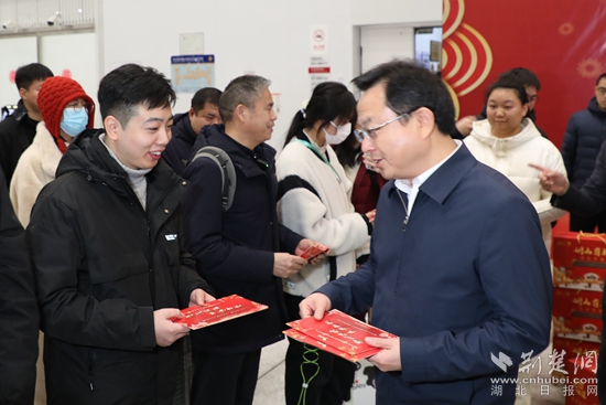 “感謝大家一年來為鄂州發(fā)展作出的貢獻(xiàn),這次通過免費(fèi)送建設(shè)者返鄉(xiāng)等多種舉措,希望能讓大家感受到鄂州這座城市的溫度?!痹跈C(jī)場(chǎng)航站樓一樓大廳,湖北省總工會(huì)領(lǐng)導(dǎo)及鄂州市領(lǐng)導(dǎo)向外來務(wù)工人員代表贈(zèng)送裝有鄂州特產(chǎn)的年貨禮包,并致以誠摯美好的新春祝福。