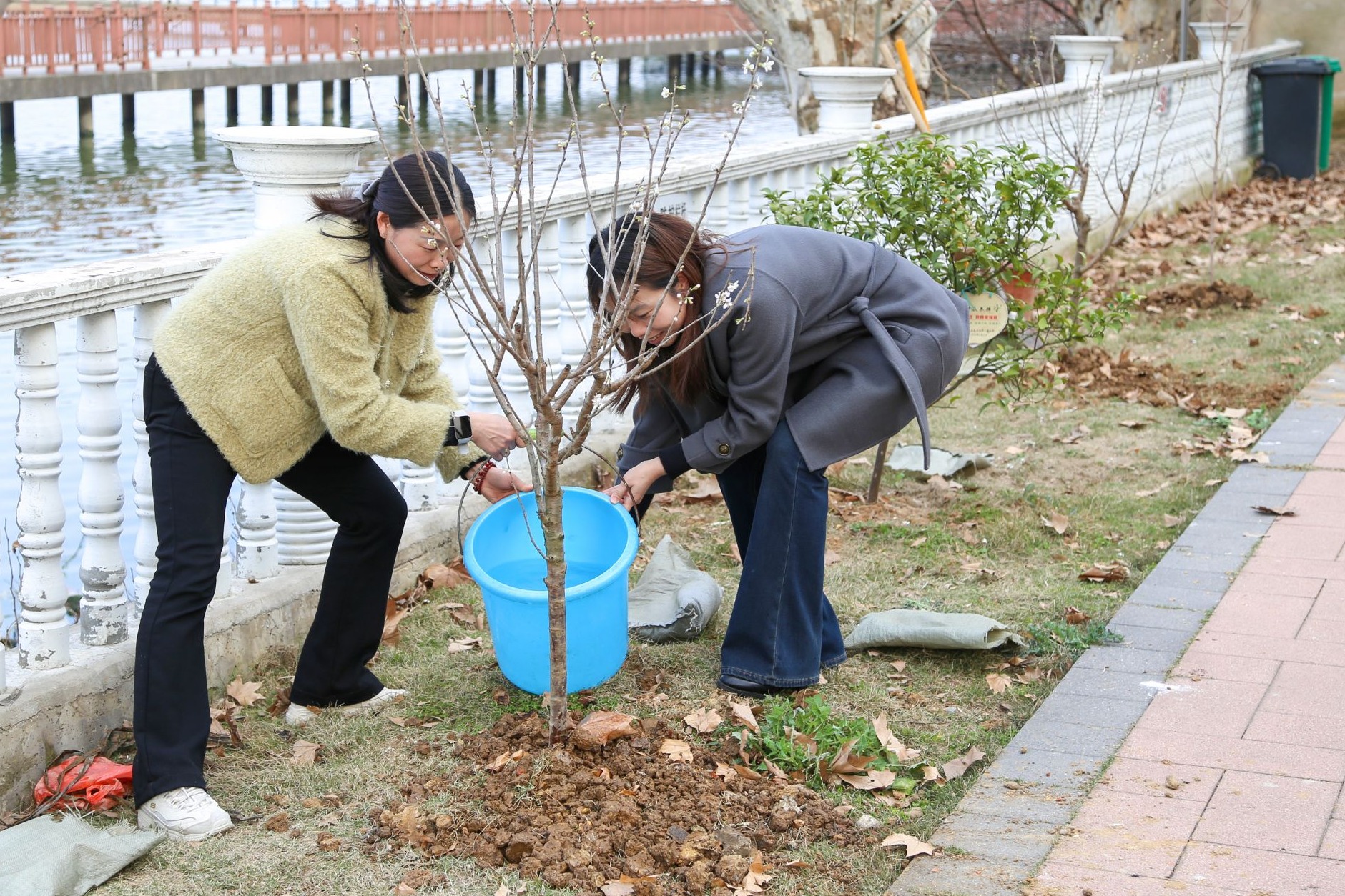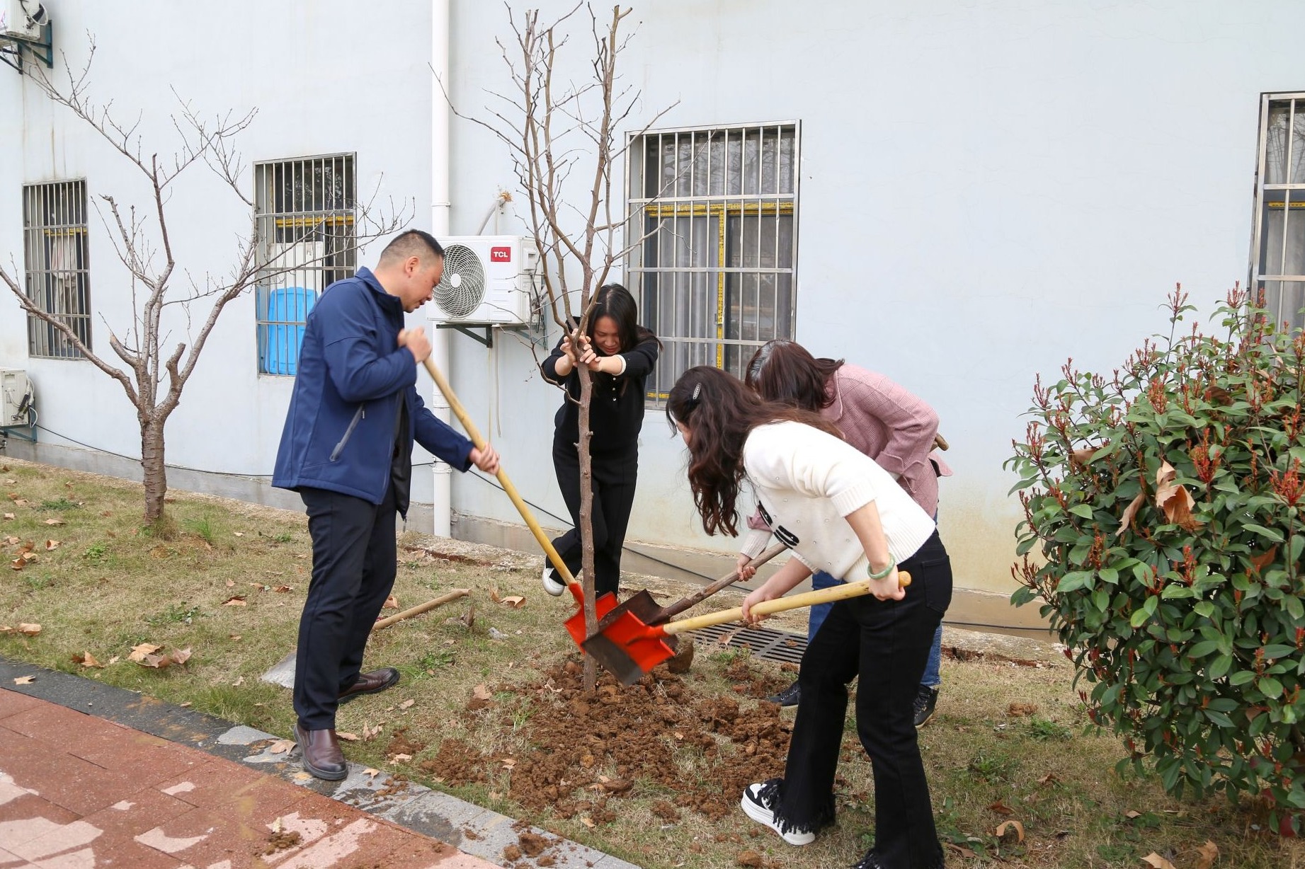 植樹地點(diǎn)選在單位后院花園,活動規(guī)模不大,但現(xiàn)場氣氛很活躍。大家笑意盎然,揮鋤培新土,施肥育根基,澆水潤新枝。經(jīng)過半小時(shí)的精心栽種,六棵樹苗傲然挺立在草坪上,為花園增添了一抹欣欣向榮的綠意。