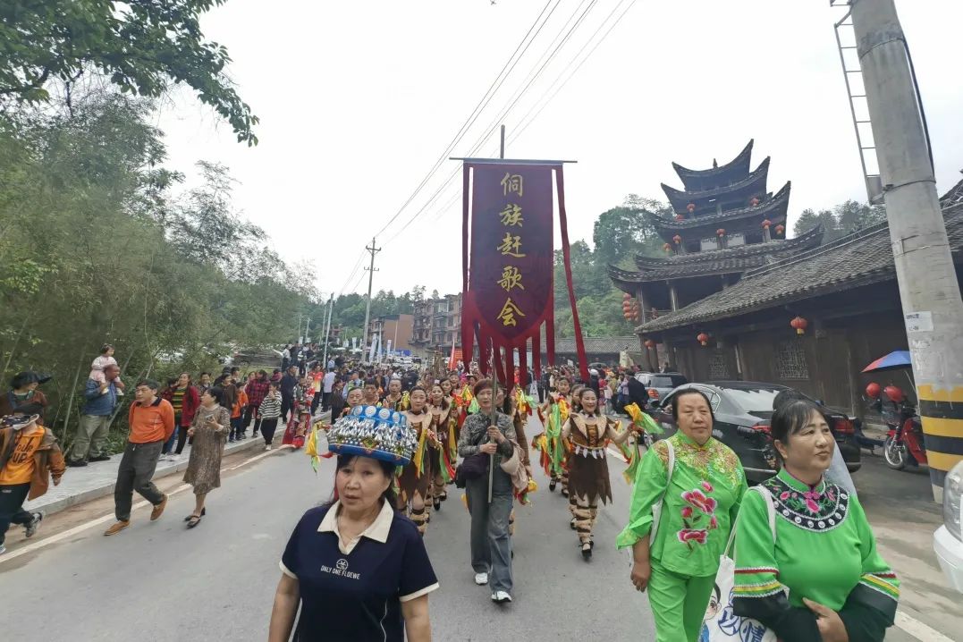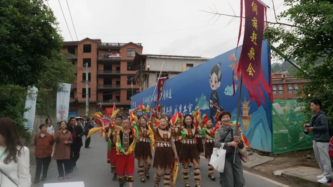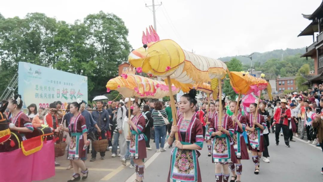隨著三聲鳴金鑼鼓響起,大型民俗文化趕歌巡游拉開帷幕。巡游隊伍身著侗族、土家族等不同少數(shù)民族的服裝,有舞獅隊、板凳龍隊、銅鈴隊、蓮香隊、腰鼓隊、農(nóng)具隊、茶花仙子隊、旗袍展示隊、各鄉(xiāng)鎮(zhèn)代表隊等隊伍近500余人組成,從林博園開始,沿路彩虹大道,直至高拱橋村委會主會場,是一場民俗特色文化展示的巡游活動。在巡游過程中還設(shè)置定點表演場地,各巡游隊伍盡情展示各自隊伍的特色。