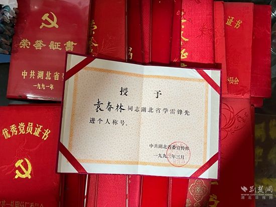 面對外界的種種聲音,老兵袁春林充耳不聞,只有幾個塑料袋里新舊不一的一摞摞證書和墻上的錦旗,無聲訴說著他的信念和堅(jiān)守。