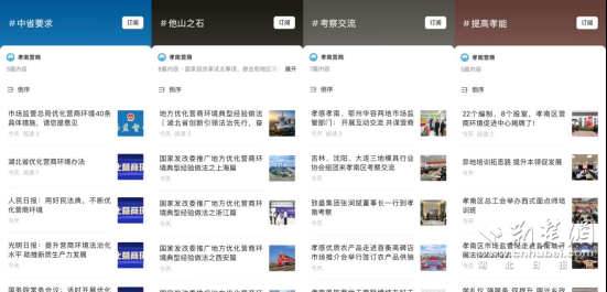 “孝納百川”欄目有4個(gè)專區(qū),分別為:“中省要求”,主要展示營商環(huán)境條例和國家、省、市發(fā)布的營商環(huán)境指導(dǎo)意見、工作方案等文件;“他山之石”,主要展示國家級(jí)改革試點(diǎn)事項(xiàng)、做法,國內(nèi)各地營商環(huán)境特色亮點(diǎn)工作以及營商世界等微信公眾號(hào)發(fā)布的最新訊息等;“考察交流”,主要展示各地各部門外出考察和外地赴孝南考察交流的有關(guān)動(dòng)態(tài);“提高孝能”,主要展示全區(qū)營商環(huán)境培訓(xùn)工作。