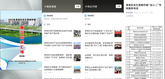 最后一個(gè)欄目“孝親熱線”有4個(gè)專區(qū),分別為:“部門熱線”,主要展示區(qū)直各部門“店小二”熱線電話和營商環(huán)境投訴舉報(bào)電話等;“政企對接”,主要展示區(qū)內(nèi)“政銀企對接”“政企早餐會(huì)、午茶會(huì)”“一點(diǎn)三員”“聯(lián)企舒困”等活動(dòng)開展情況;“服務(wù)首衡”,主要展示“頭號(hào)工程”和“一號(hào)工程”的“雙向奔赴”,即各地各部門服務(wù)首衡城工作情況;“惠企政策”,主要展示的是孝南區(qū)的各項(xiàng)惠企惠民政策。