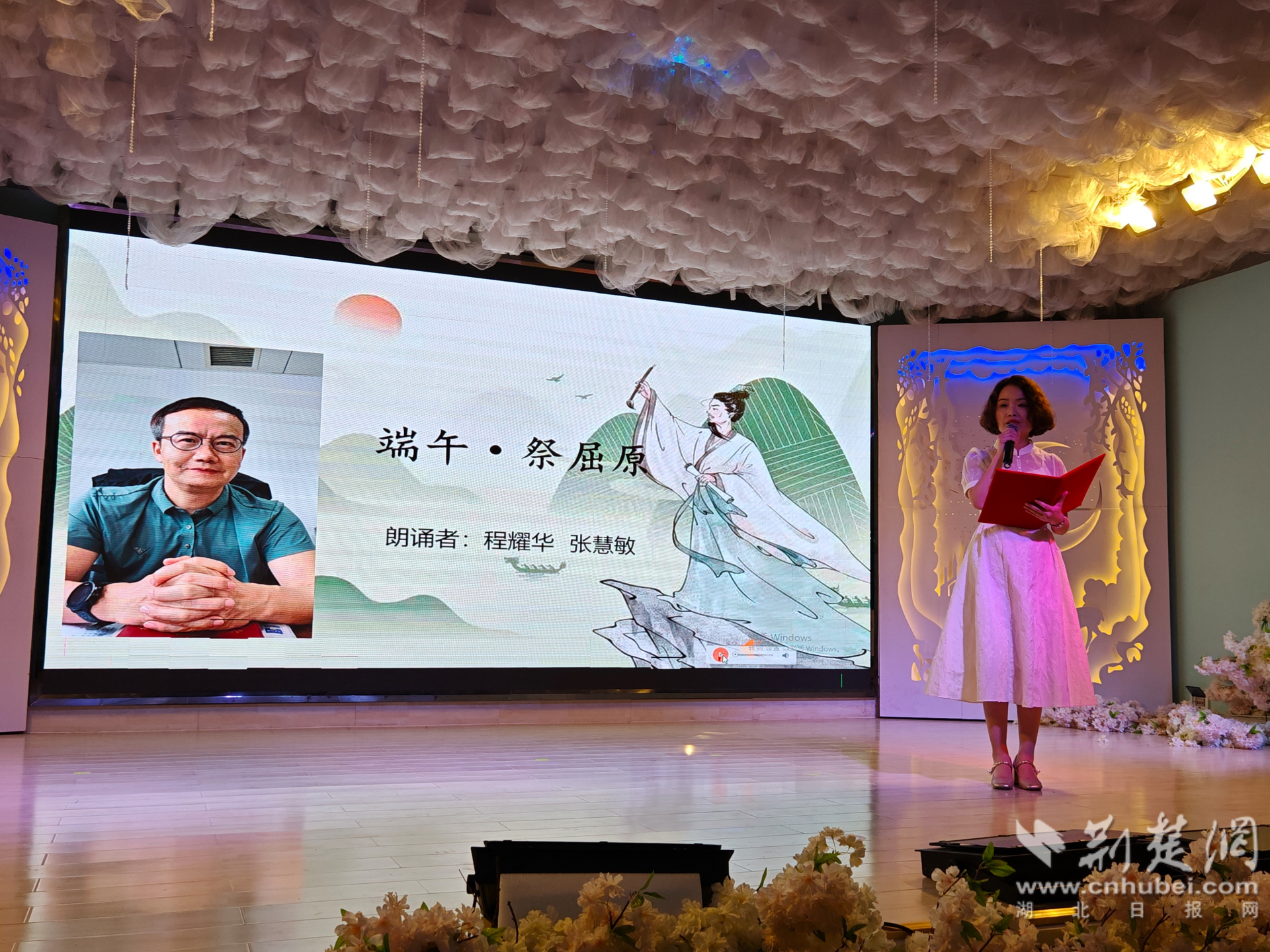 端午也是懷古思鄉(xiāng)的時(shí)節(jié)。活動(dòng)現(xiàn)場(chǎng),廣州的云夢(mèng)籍老鄉(xiāng)、廣東廣播電視臺(tái)資深新聞節(jié)目主持人、第十屆廣東新聞金話筒獎(jiǎng)獲獎(jiǎng)?wù)叱桃A隔空與云夢(mèng)縣朗協(xié)秘書長張慧敏千里相隔、同屏共同演繹《端午 祭屈原》。端午傳情,粵、鄂隔空連線同屏誦經(jīng)典,觀眾細(xì)聽慢品,引起大家共鳴,博得陣陣掌聲。聽眾陳芳說:“今天太享受了,很震撼呀!耳朵和眼睛都醉了!”另一觀眾也說:“太享受了,朗誦者把我們帶入遙遠(yuǎn)的年代,帶入情景交融的美妙世界,真是讓人陶醉!”