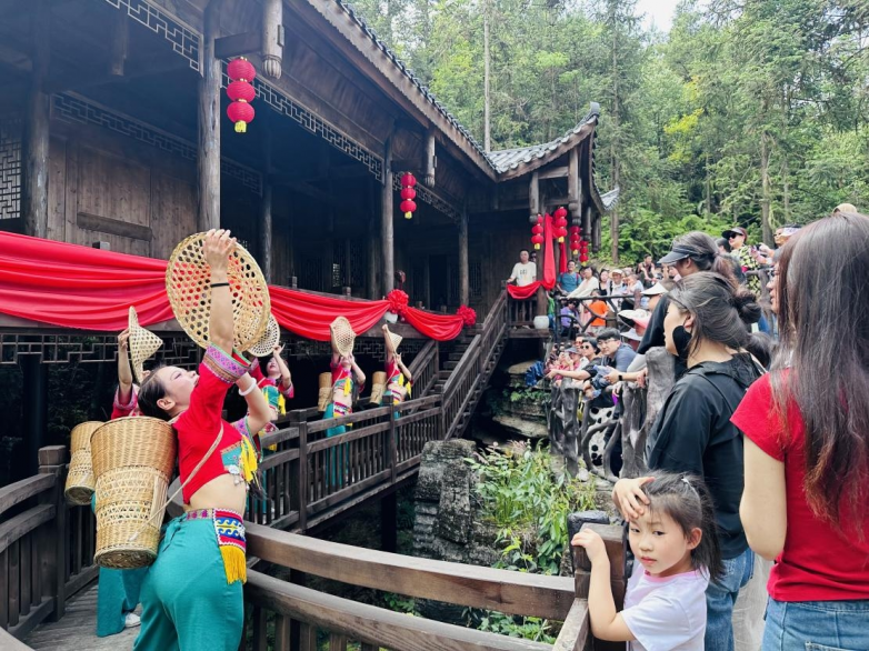 熱情洋溢的迎客攔門酒,大型情景劇《戀上梭布埡 愛在女兒會》讓遠(yuǎn)道而來的游客感受到了土家兒女熱情好客的情誼和豐富多彩的民俗文化。
