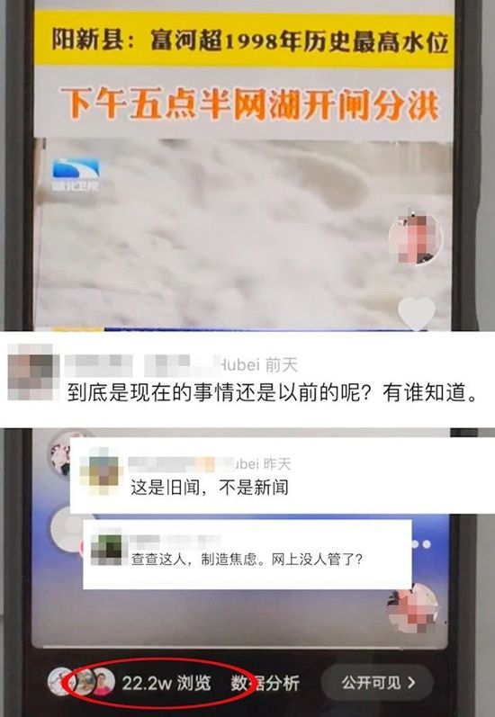 該視頻一經(jīng)發(fā)布,立即引起了廣大網(wǎng)民的關(guān)注和擔(dān)憂,誤導(dǎo)網(wǎng)民認(rèn)為發(fā)生了洪災(zāi)險(xiǎn)情。相關(guān)視頻發(fā)布后瀏覽量達(dá)22.2萬(wàn)人次,在一定程度上引發(fā)了公眾恐慌。