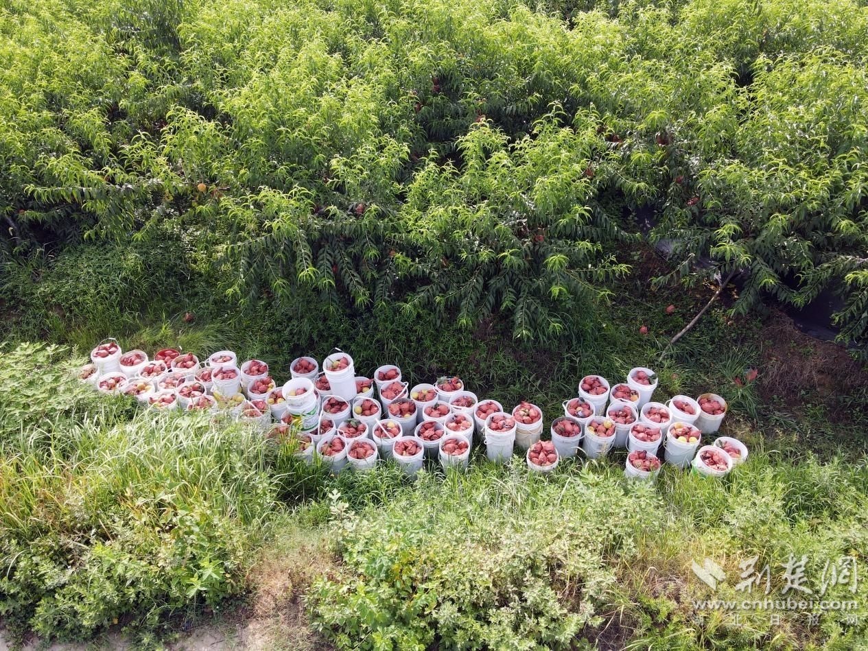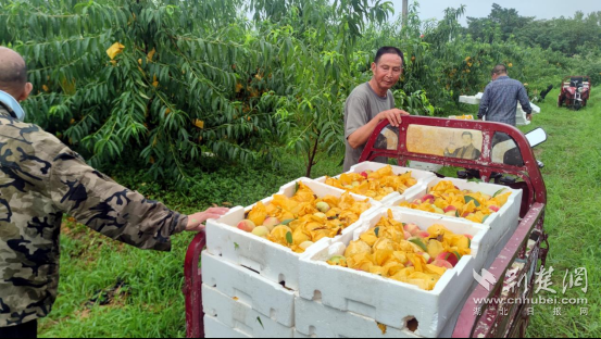 “目前上市的是水蜜桃,從浙江引進(jìn)而來,果色猶如夕陽下太湖波光粼粼的湖面,口感香甜多汁。故名‘湖景蜜露’,我們種植的這個(gè)水蜜桃,在湖北省桃評(píng)比中獲得了金獎(jiǎng)。過段時(shí)間就是錦繡黃桃上市的季節(jié),整個(gè)果園有10來個(gè)品種的桃子,預(yù)計(jì)產(chǎn)量可達(dá)到300萬斤。”劉明說。