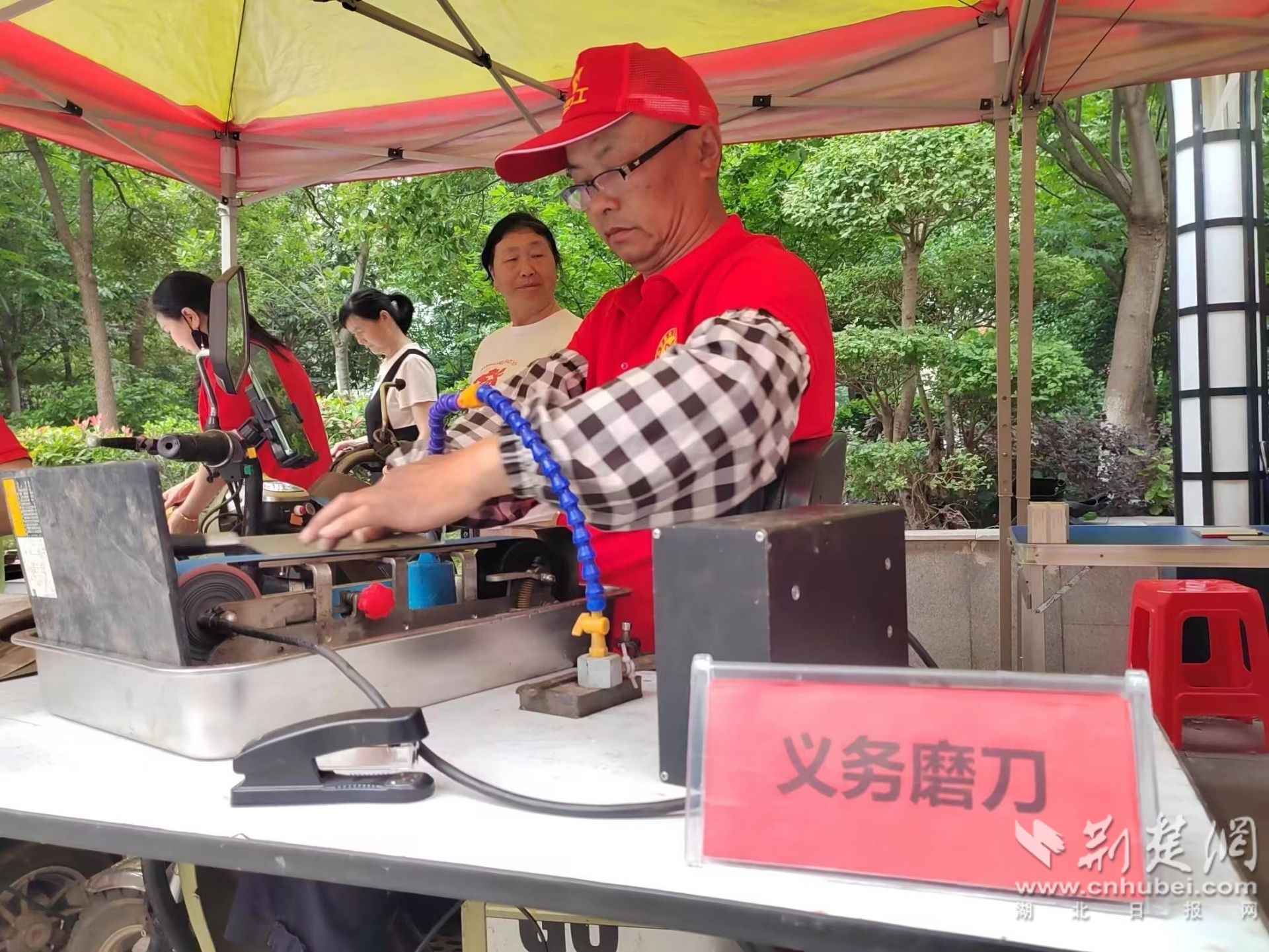 在一次志愿活動(dòng)中,他所在的攤位前人滿為患,只見(jiàn)他接過(guò)刀具,先刀頭后刀尾,一壓一拉,灑水降溫,如此反復(fù),動(dòng)作干凈利落,原本銹鈍的刀具重新變得鋒利光亮。他嫻熟的技藝引來(lái)不少人圍觀,居民絡(luò)繹不絕,直至活動(dòng)結(jié)束仍有人將家里的刀具送來(lái)打磨。