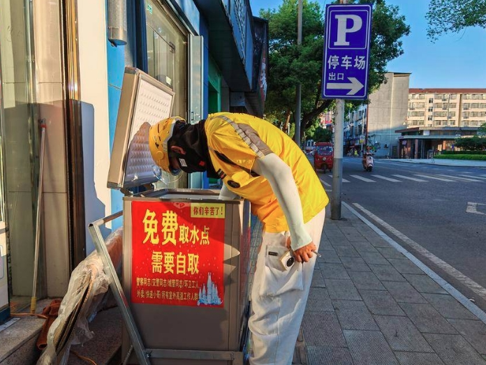 上午9點(diǎn)多,氣溫已升到30多度,忙碌了幾個(gè)小時(shí)的環(huán)衛(wèi)工人來(lái)到免費(fèi)取水點(diǎn),一口冰涼的礦泉水喝下去讓他們十分愜意,此時(shí)同樣來(lái)此處免費(fèi)取水點(diǎn)的還有一群外賣小哥。