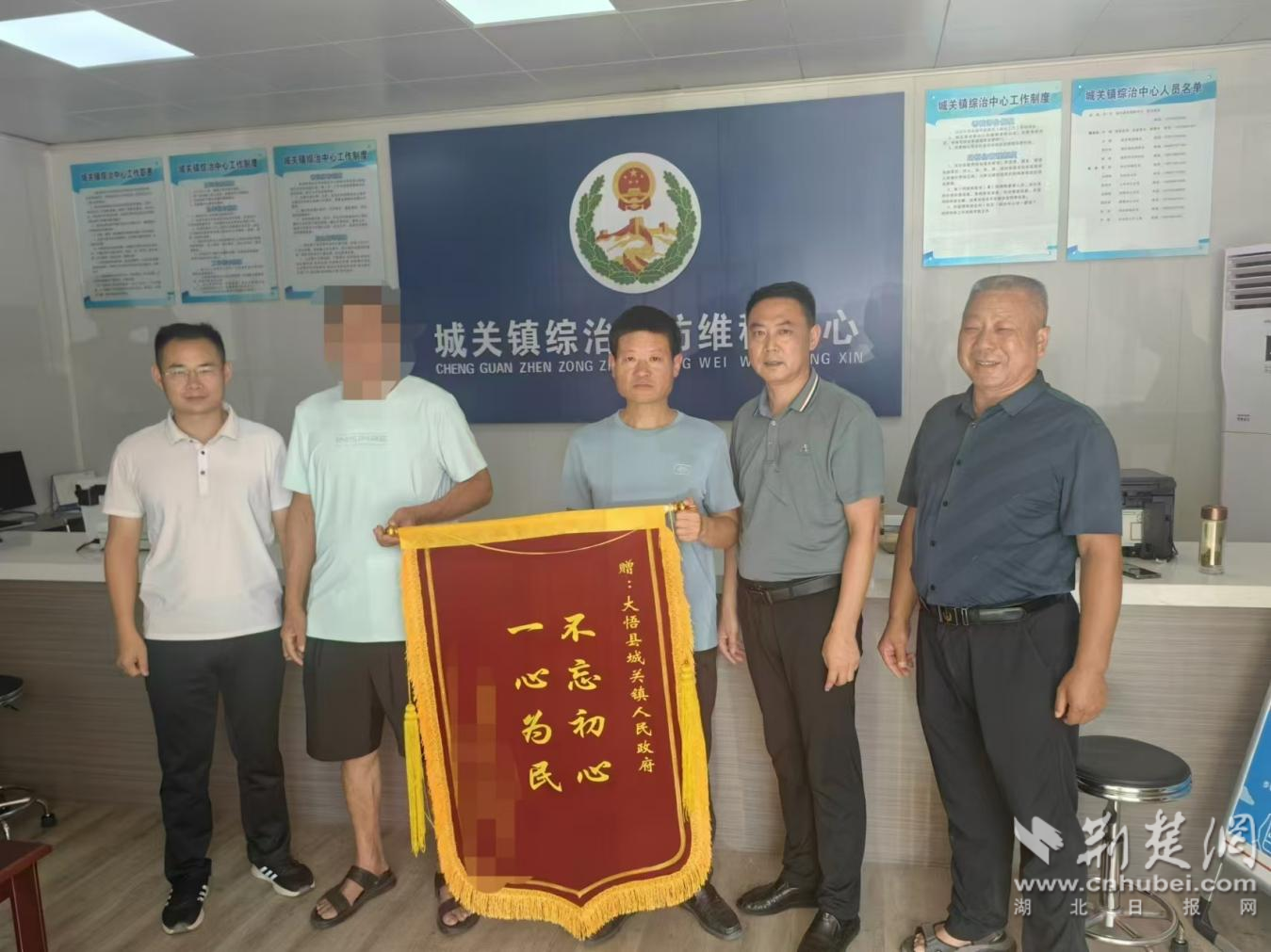 荊楚網(wǎng)(湖北日?qǐng)?bào)網(wǎng))訊(通訊員 劉陽(yáng))8月13日,大悟縣城關(guān)鎮(zhèn)中心村村民胡某和家屬將一面印有“不忘初心,一心為民”的錦旗送到鎮(zhèn)政府干部手中,感謝社會(huì)各界幫助尋回離家出走的女兒。