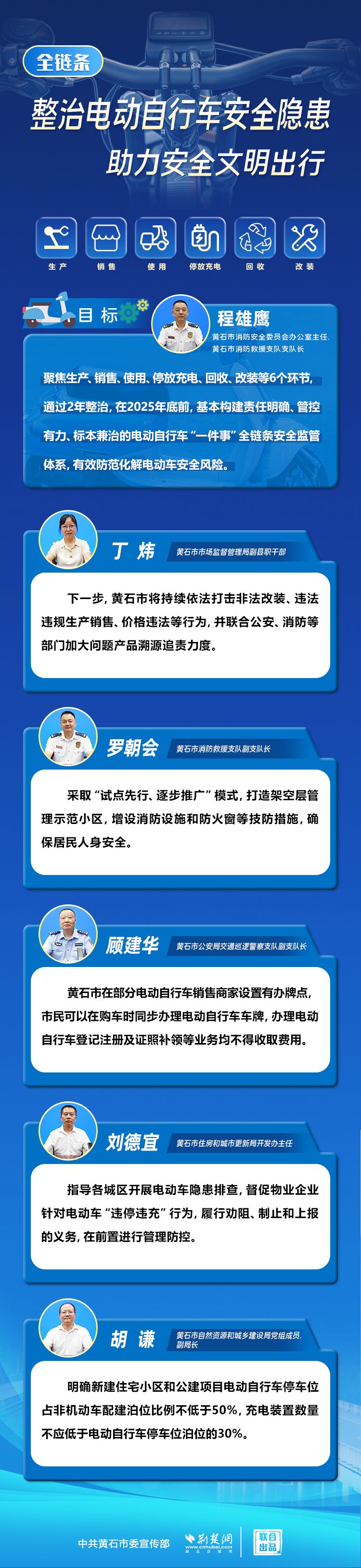 荊楚網(wǎng)(湖北日報網(wǎng))訊(記者 劉璐 通訊員 李玉)8月15日,黃石召開新聞發(fā)布會,通報全市電動自行車安全隱患全鏈條整治行動總體情況。會上提出,在2025年底前,基本構(gòu)建責(zé)任明確、管控有力、標(biāo)本兼治的電動自行車“一件事”全鏈條安全監(jiān)管體系。