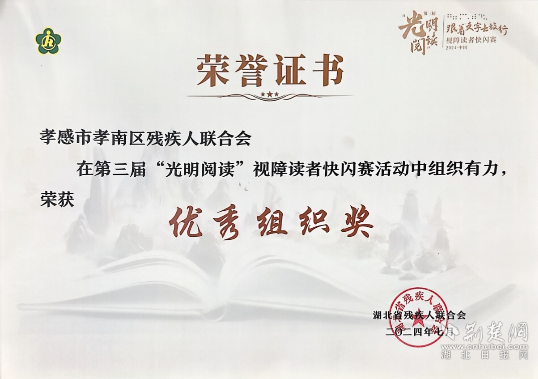 荊楚網(wǎng)(湖北日報網(wǎng))訊(通訊員 吳凌)近日,第三屆全國”光明閱讀"快閃賽組委會公布獲獎名單,孝南區(qū)殘聯(lián)榮獲“優(yōu)秀組織獎”榮譽稱號,孝南區(qū)視障讀者代表梁國紅被評為省級”閱讀之星”,8月22日下午,孝南區(qū)殘聯(lián)為梁國紅及時送了喜報。