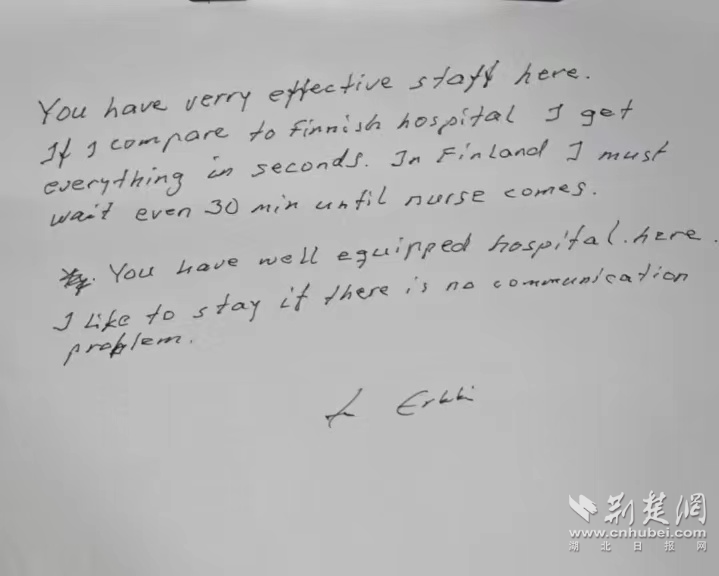 荊楚網(wǎng)(湖北日報網(wǎng))訊(記者葉修頎 通訊員袁曼)9月8日,孝感市中心醫(yī)院呼吸與危重癥醫(yī)學(xué)科II病區(qū)的芬蘭患者羅斯塔蒂克在出院之際,留下了一封手寫感謝信,雖短短數(shù)語,卻是他由衷的感謝,字里行間,真情流露。