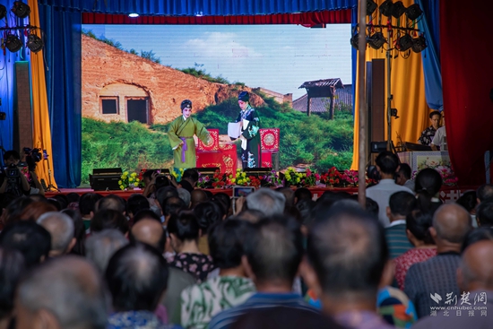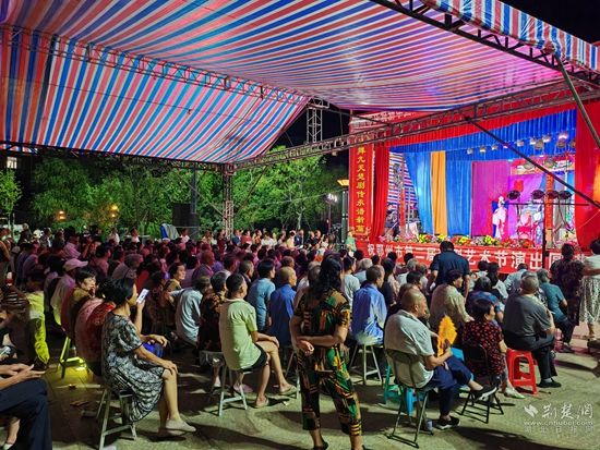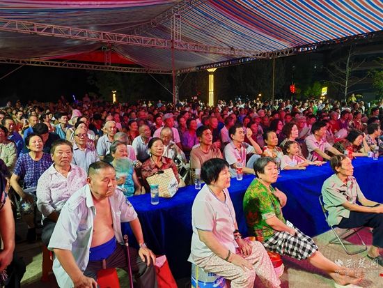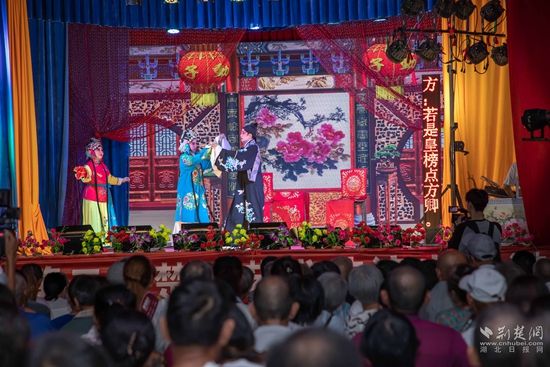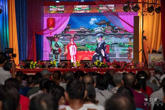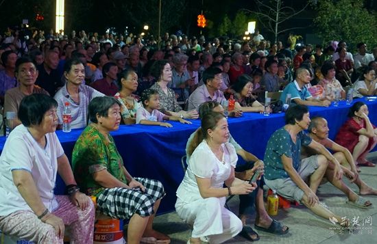 當晚7點,廣場上人聲鼎沸、鑼鼓喧天、座無虛席,來自周邊村鎮(zhèn)的老百姓偕老扶幼聚集于此,共襄楚劇盛會。