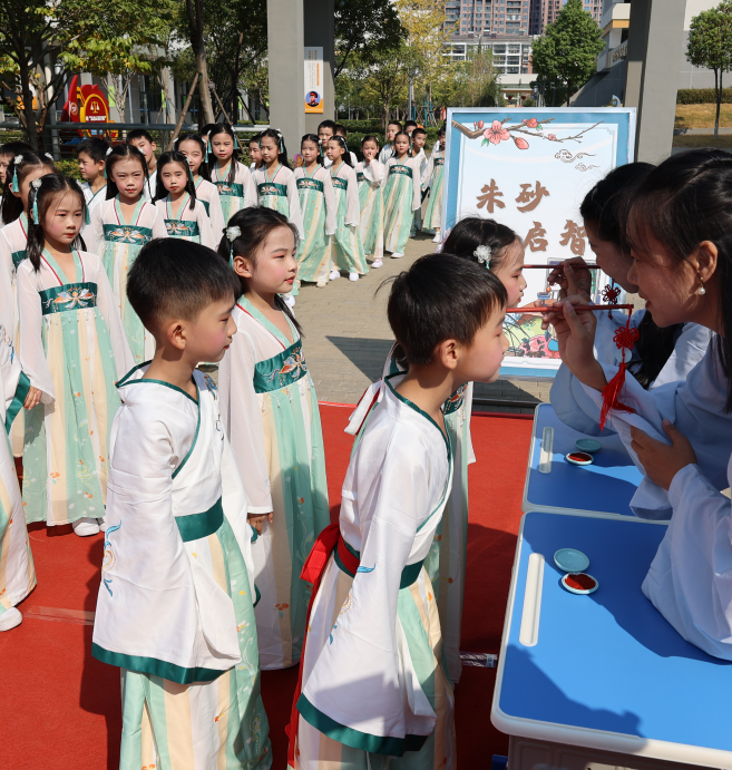上午十時許,校園廣場上,學(xué)生們在教師的帶領(lǐng)下,整齊列隊,面向孔子的畫像肅立。老師手持朱砂筆,為每位學(xué)生額頭點上一點紅,進(jìn)行“朱砂開智”的儀式,寓意開啟智慧之門。每一筆朱砂都蘊(yùn)含著對學(xué)識的期許和對未來的祝愿。