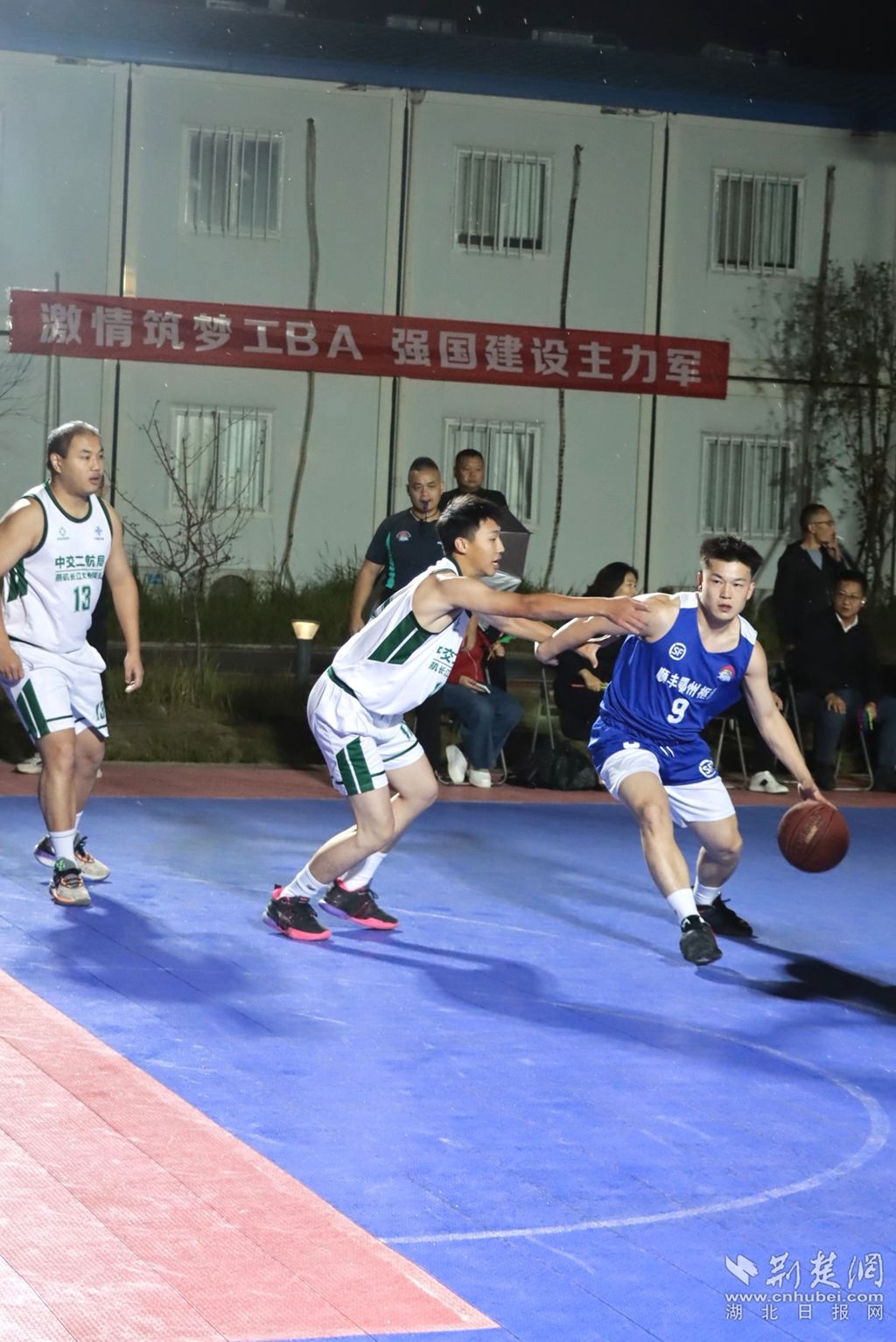 10月19日晚,燕磯長江大橋項目部迎來一場別開生面的籃球盛宴,鄂州第二屆“工BA”職工男子籃球賽首次走進項目工地,鄂東南青鋒隊與順豐鄂州樞紐隊展開激烈對決。