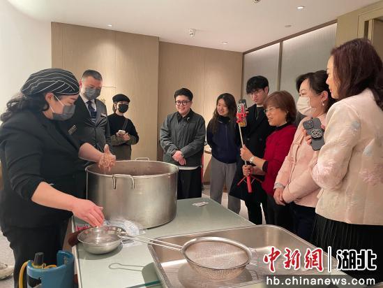 艷陽天酒店的黃燜圓子制作技藝是武漢市非物質(zhì)文化遺產(chǎn)。當天,在艷陽天酒店大廚指導(dǎo)下,臺胞們學(xué)習(xí)制作炸圓子。他們戴上手套,將豬肉、魚茸等調(diào)制而成的餡料擠成丸子形狀,放入鍋中,待炸至金黃撈出,香氣四溢開來。