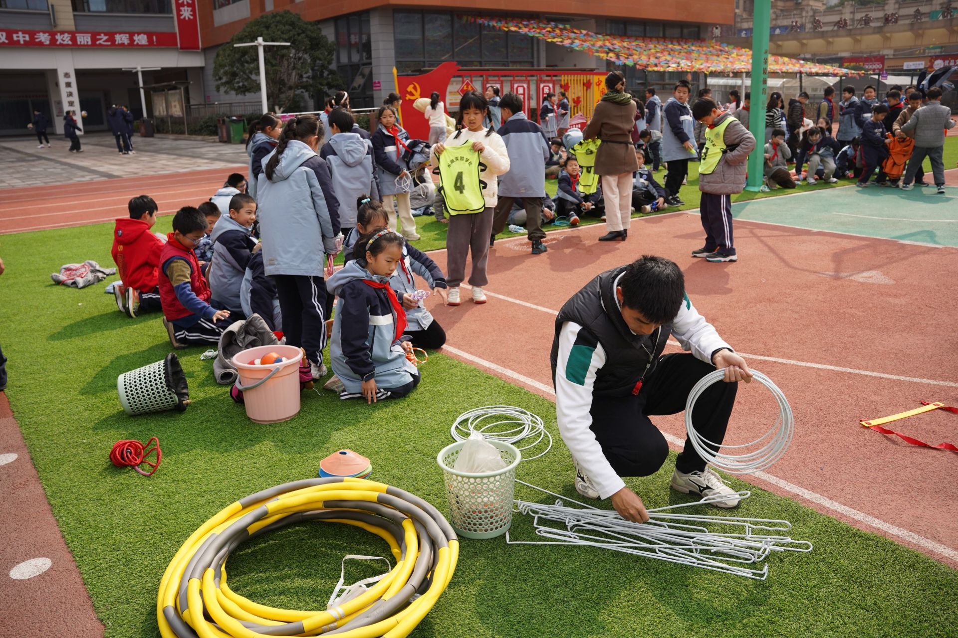 東湖實驗學校老師正在為大課間準備活動器具。張媛 攝