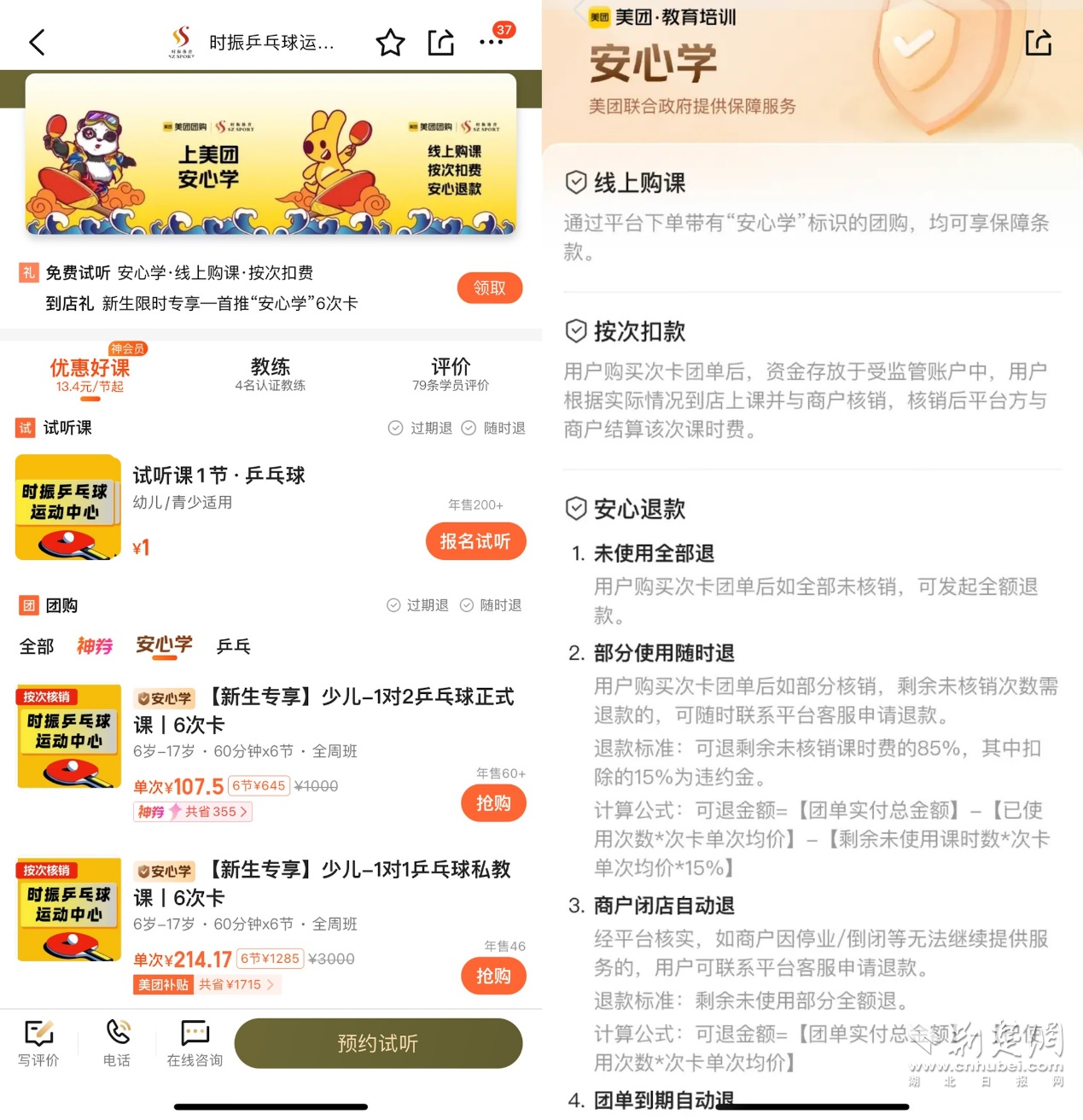 據(jù)了解,“安心學”是美團聯(lián)合各地政府部門,面向教育培訓領域創(chuàng)新推出的履約交易保障新模式,主要依托平臺的多次卡團購產(chǎn)品,在運動培訓、書法、科學探索、棋藝、美術、國學、音樂等非學科類培訓品類推出按次扣費的短期課,給消費者提供靈活、可靠的消費保障。