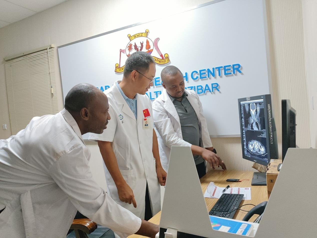 張建東主任指導(dǎo)當(dāng)?shù)蒯t(yī)生進(jìn)行影像分析。中國援桑醫(yī)療隊(duì)供圖