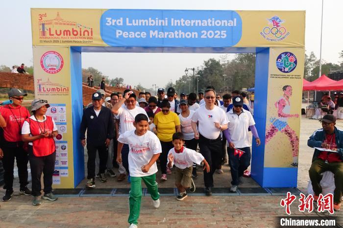 3月22日清晨,2025尼泊爾藍毗尼國際和平馬拉松開跑,尼泊爾奧委會主席吉萬·拉姆·什雷斯塔、中國駐尼泊爾大使陳松等嘉賓參加3公里和平行健步走活動。中新社記者 崔楠 攝