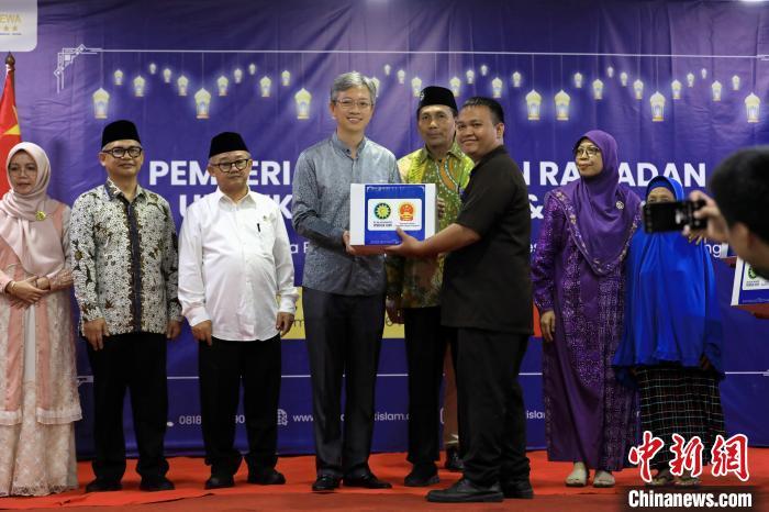 圖為王魯彤大使代表使館向印尼困難民眾代表捐贈齋月慈善愛心包裹。中新社記者 李志全 攝