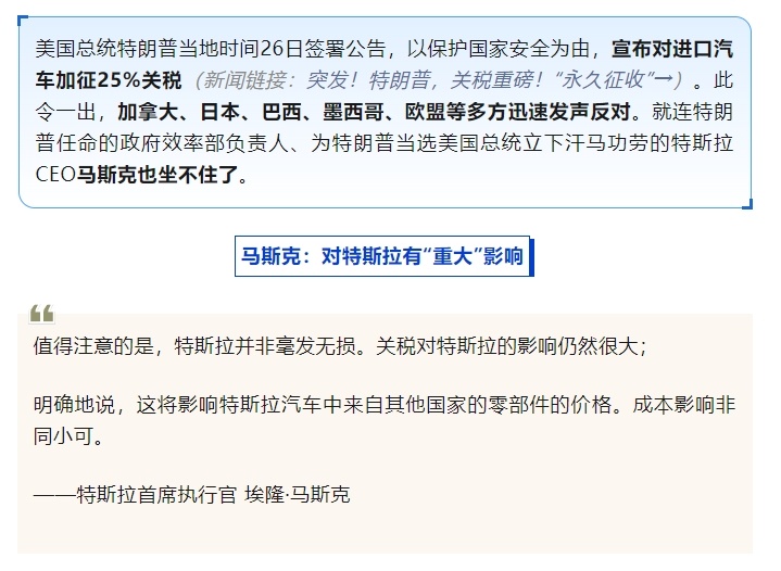 美國特斯拉公司首席執(zhí)行官埃隆·馬斯克26日在社交媒體平臺上表示,美國總統(tǒng)特朗普的汽車關(guān)稅政策將對特斯拉產(chǎn)生“重大”影響。馬斯克稱,這將影響來自其他國家的特斯拉汽車零部件的價格。