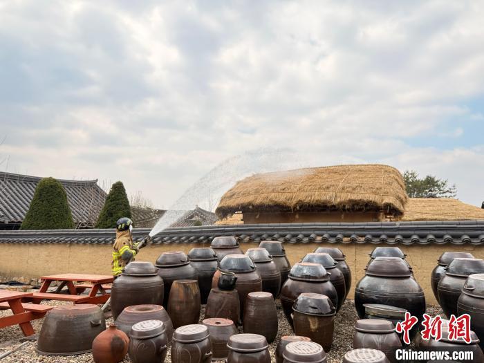 當?shù)貢r間3月28日,消防員在韓國“河回村”進行噴水作業(yè)?!≈行律缬浾?劉旭 攝
