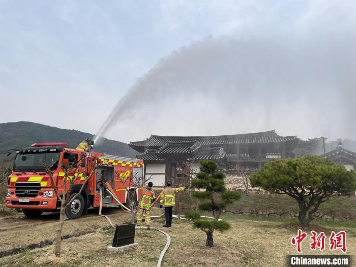 當?shù)貢r間3月28日,消防員在韓國屏山書院進行噴水作業(yè)?!≈行律缬浾?劉旭 攝