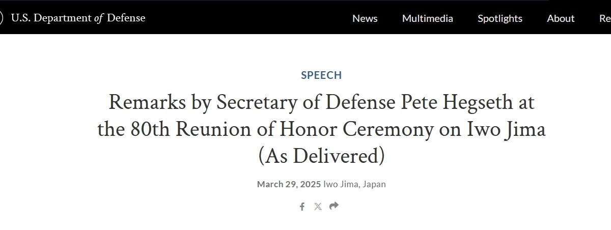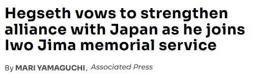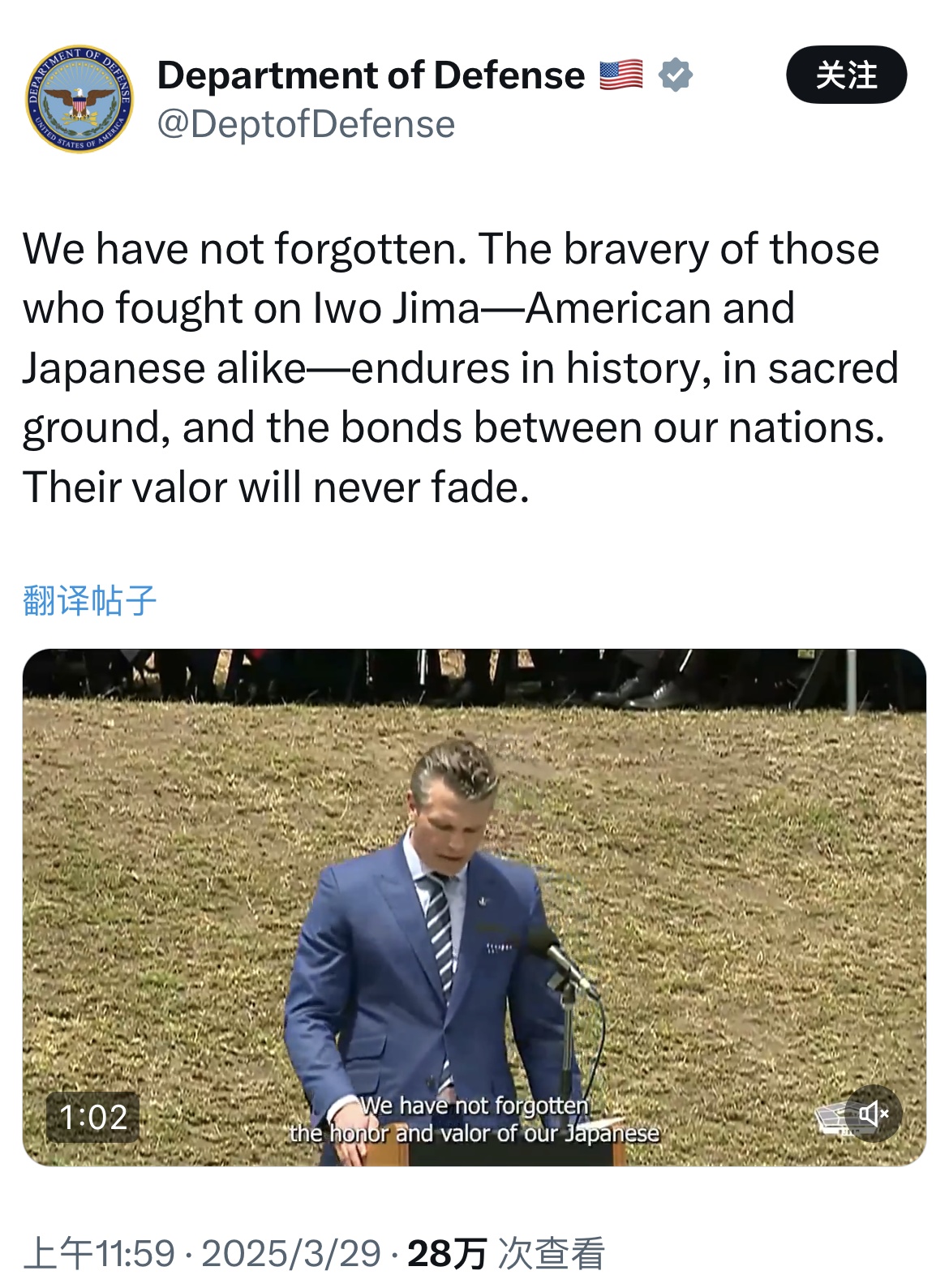 外媒報(bào)道:赫格塞思在參加硫磺島戰(zhàn)役紀(jì)念儀式上,誓言要加強(qiáng)與日本的聯(lián)盟