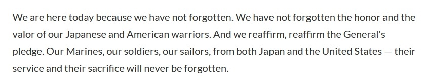 赫格塞思在致辭時(shí)稱(chēng):“我們不會(huì)忘記在硫磺島作戰(zhàn)的美國(guó)和日本士兵展現(xiàn)出的勇敢精神。這種精神,將在歷史的長(zhǎng)河中、在這片神圣的土地上,以及美日兩國(guó)的盟友關(guān)系間永垂不朽,他們的英勇事跡永不褪色?!?/p>