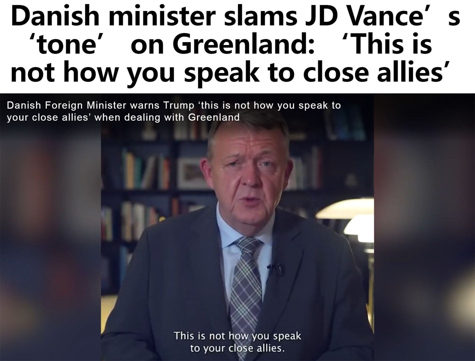 丹麥外交大臣拉斯穆森29日在社交媒體上發(fā)表視頻講話(huà),批評(píng)萬(wàn)斯有關(guān)格陵蘭島表態(tài)的“調(diào)調(diào)”。
