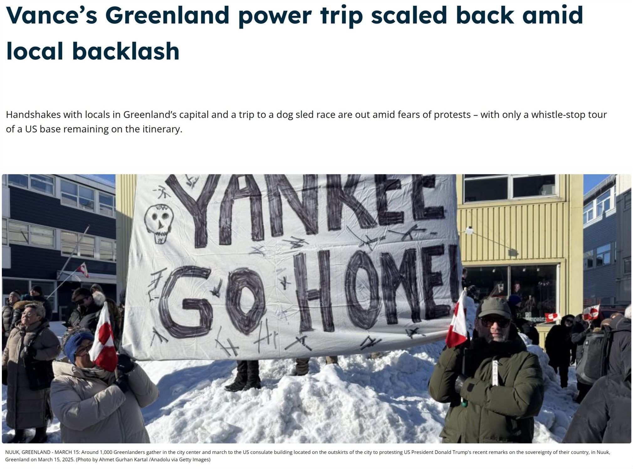 事實(shí)上,萬(wàn)斯一行此次對(duì)格陵蘭島的訪(fǎng)問(wèn)相當(dāng)不受歡迎。