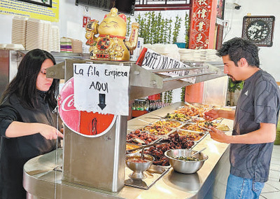 在墨西哥城一家中餐自助餐廳內(nèi),當(dāng)?shù)厥晨吞暨x菜品。人民日報墨西哥分社 埃內(nèi)斯托·多明戈斯攝