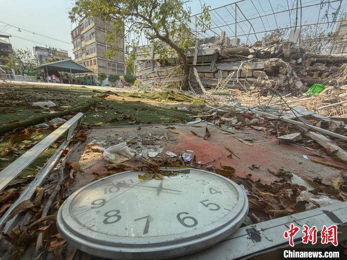 當(dāng)?shù)貢r間4月2日,因地震造成教學(xué)樓坍塌的緬甸曼德勒孔教學(xué)校北校區(qū)現(xiàn)場,一臺時鐘“躺”在廢墟中,時間定格在地震發(fā)生的一刻?!≈行律缬浾?陳永諾 攝