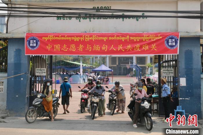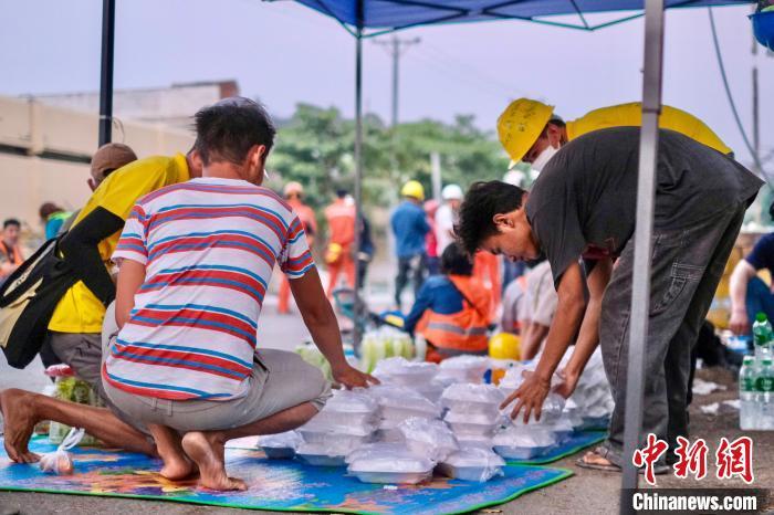 當(dāng)?shù)貢r間4月3日傍晚,中國救援隊伍在緬甸曼德勒一倒塌建筑持續(xù)搜救,當(dāng)?shù)孛癖姙榫仍犼爢T準(zhǔn)備盒飯,感謝他們的幫助。 中新社記者 陳永諾 攝
