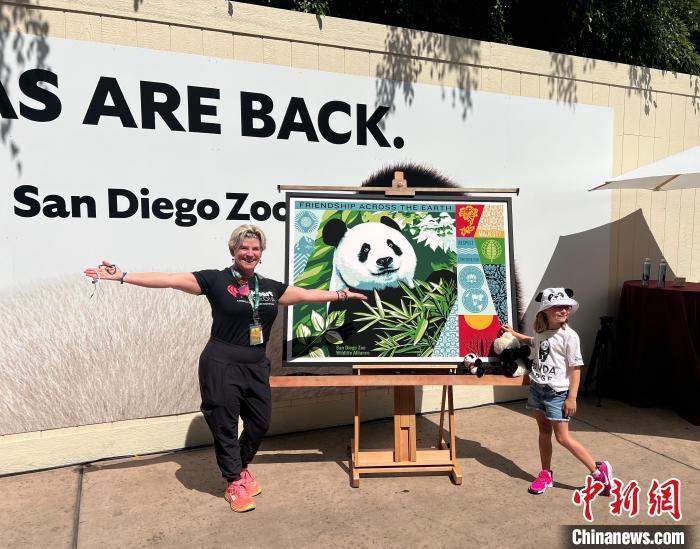 當(dāng)?shù)貢r間2024年8月8日,美國加利福尼亞州圣迭戈動物園舉行“熊貓嶺”開館儀式,大熊貓“云川”和“鑫寶”首度正式與公眾見面。圖為人們在圣迭戈動物園的大熊貓海報前拍照留念?!≈行律缬浾?張朔 攝