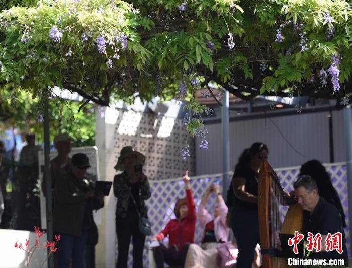 當地時間4月12日,2025年紫藤花節(jié)在美國加利福尼亞州洛杉磯郡塞拉馬德雷市舉行。圖為人們在“紫藤花園”欣賞音樂、觀賞花朵。 中新社記者 張朔 攝